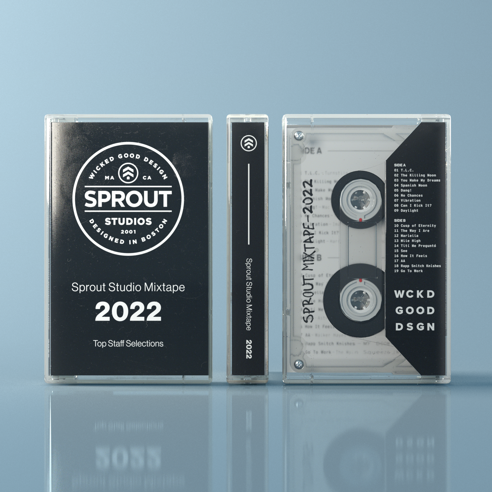 A spoof of the famous Spotify Wrapped, we showcased the personality of our diverse studio through everyone’s #1 song of 2022. After brainstorming naming and design concepts, I created our Sprout Mixtape designs in Illustrator and handed off to Visualization to render into a cassette tape.
